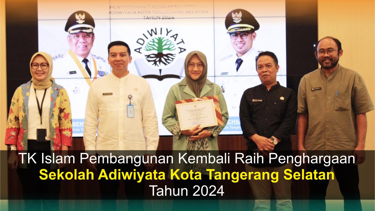 TK Islam Pembangunan (TKIP) berhasil mempertahankan penghargaan sebagai Sekolah Adiwiyata Tingkat Kota Tangerang Selatan pada tahun 2024. Sebagaimana diketahui, Penghargaan Sekolah Adiwiyata merupakan sebuah penghargaan yang diberikan bagi sekolah yang berhasil melaksanakan gerakan PBLHS (peduli dan berbudaya lingkungan hidup di sekolah), yaitu aksi kolektif secara sadar, sukarela, berjejaring, dan berkelanjutan yang dilakukan oleh sekolah dalam menerapkan perilaku ramah lingkungan hidup. Penghargaan ini diberikan pada hari Jumat, 6 September 2024, dengan undangan kepada perwakilan TKIP yakni Ibu Hj. Ratu Linda Martina Andryani, S.T., M.M. selaku Kepala Sekolah TK Islam Pembangunan untuk menghadiri penyerahan sertifikat penghargaan di Blandongan, Pusat Pemerintahan Kota Tangerang Selatan.
